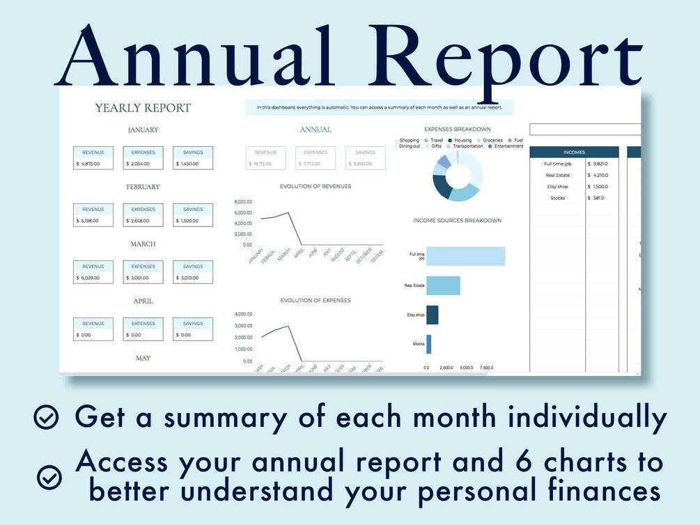 Access two detailed dashboards, one where you can select a month and another one a year. Improve your personal finances by analyzing your results.