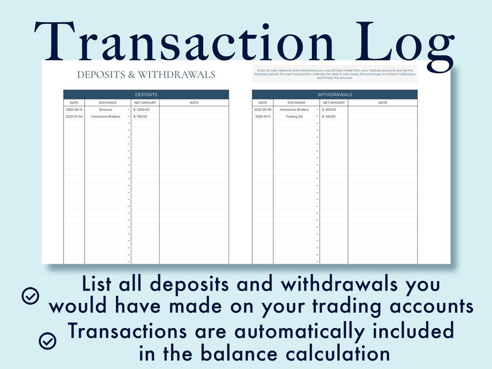 Enter every deposit and withdrawal you would have made to your trading accounts. These transactions are directly included in the total balance calculation.
