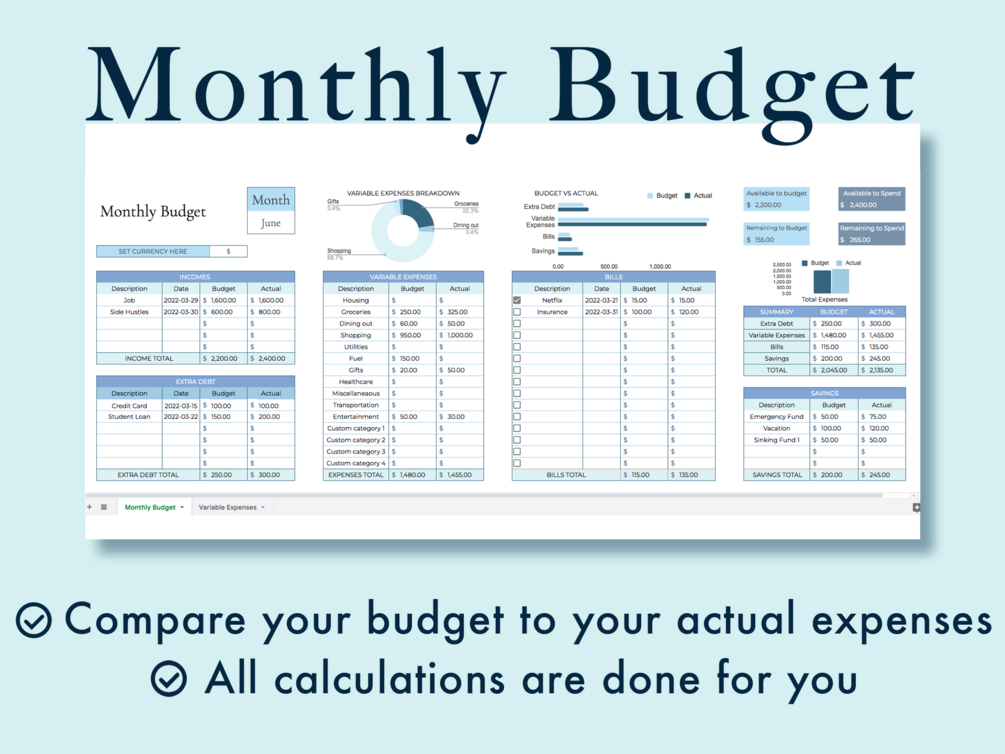 This spreadsheet allows you to compare your projected expenses and income with what you actually earned and spent. Easily visualize your budget with comprehensive charts.
